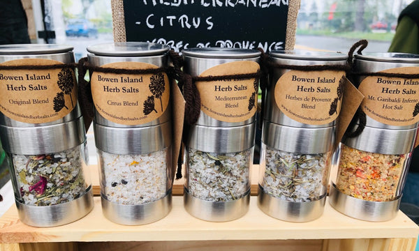 At Bowen Island Herb Salts we take our garden seriously. We make sure that our herbs, berries & trees enjoy the best growing conditions and care our little island in the Salish Sea has to offer. Only the finest leaves, sprigs, flowers, berries and wood trimmings are hand selected. The journey takes our harvests through a small batch sorting and drying process before they are teamed up with our purposely selected natural salts and international sugars and transformed into our beautiful signature herb blends. We collect our cedar, apple & cherry wood trimmings to gently smoke our salts & peppercorns and create our unique flavours. Our high quality hand crafted herb salts, berry sugar, smoked salts, smoked peppercorns and mulling spice make attractive gifts for people who appreciate the unique flavour our products add to any meal.